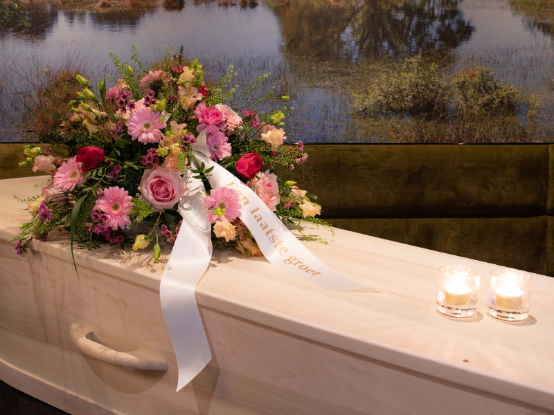 Rouwarrangement dat als bloemstuk op water is gestoken om bij een overledene te plaatsen op of bij de kist. Stuk is meestal een aantal dagen houdbaar. Getoonde formaat is middel.